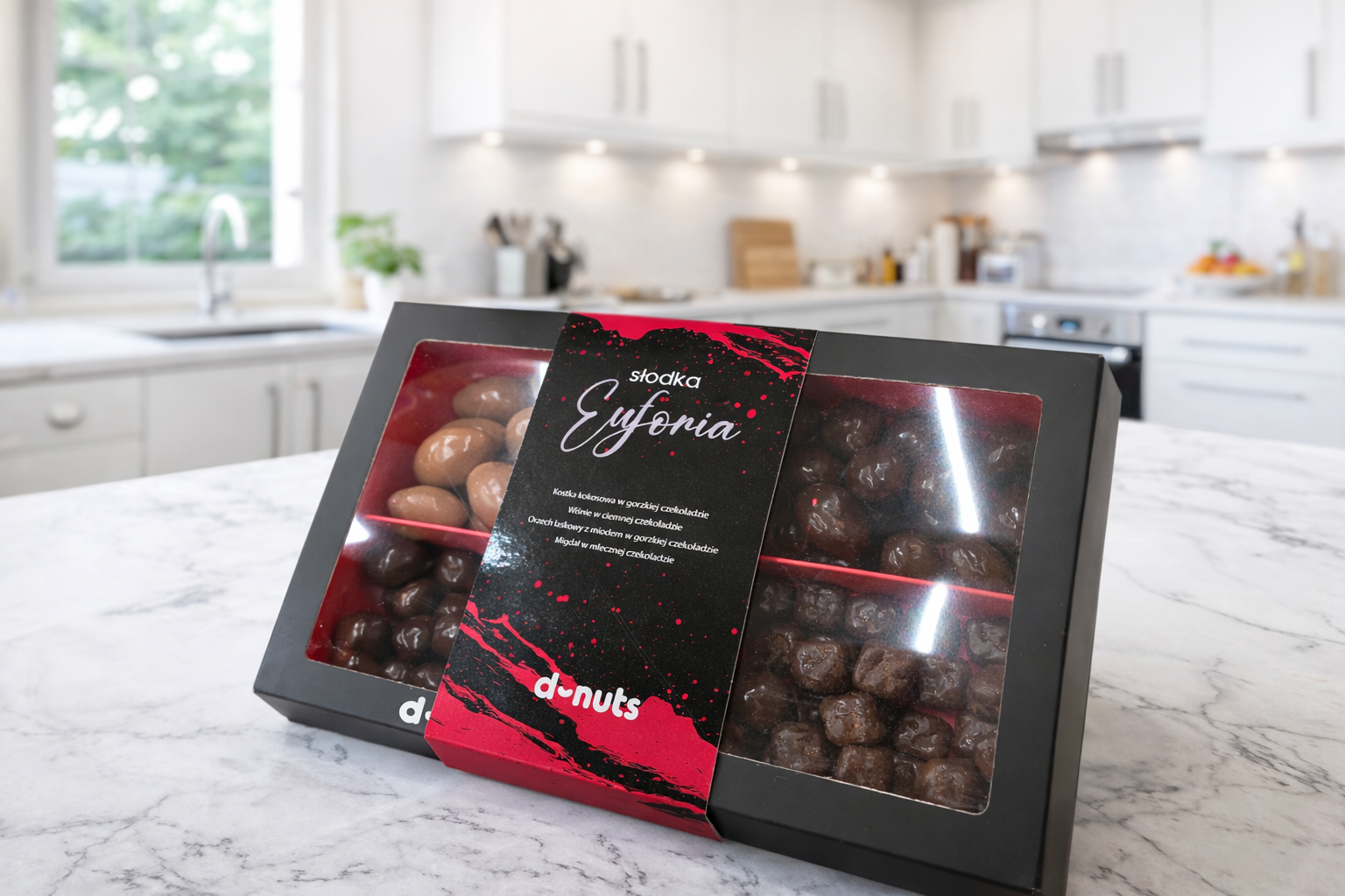 Zanurz się w świecie wyjątkowych smaków z boxem Słodka Euforia. To starannie skomponowany zestaw orzechów w czekoladzie i luksusowych słodyczy, który zachwyci każdego miłośnika wyjątkowych przekąsek. Idealny prezent dla niej i dla niego, do kawy lub na chwilę relaksu w ciągu dnia. Box Słodka Euforia to elegancki zestaw orzechów w czekoladzie i owoców oblanych najwyższej jakości czekoladą. Starannie skomponowany box prezentowy, który łączy luksusowe słodycze, intensywne smaki i estetyczną formę. Idealny wybór, jeśli szukasz prezentu premium dla bliskiej osoby lub wyjątkowej słodkiej przekąski.