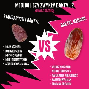Zwykłe daktyle są zazwyczaj mniejsze, twardsze i bardziej wysuszone, przez co ich smak jest mniej intensywny, a konsystencja mniej przyjemna. Medjool to zupełnie inny poziom jakości i doświadczenia smakowego.