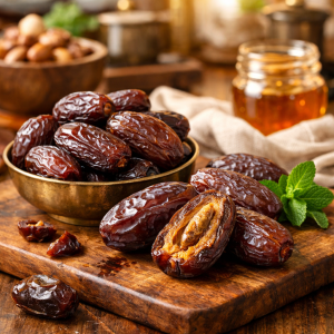 Daktyle Medjool zwane także Medjoul Jumbo to jedna z najbardziej cenionych odmian daktyli na świecie. Wyróżniają się dużym rozmiarem, wyjątkową mięsistością oraz naturalnym, karmelowo-miodowym smakiem. Nazywane „królem daktyli”, stanowią produkt klasy premium, który doskonale sprawdza się zarówno jako zdrowa przekąska, jak i składnik wielu potraw.