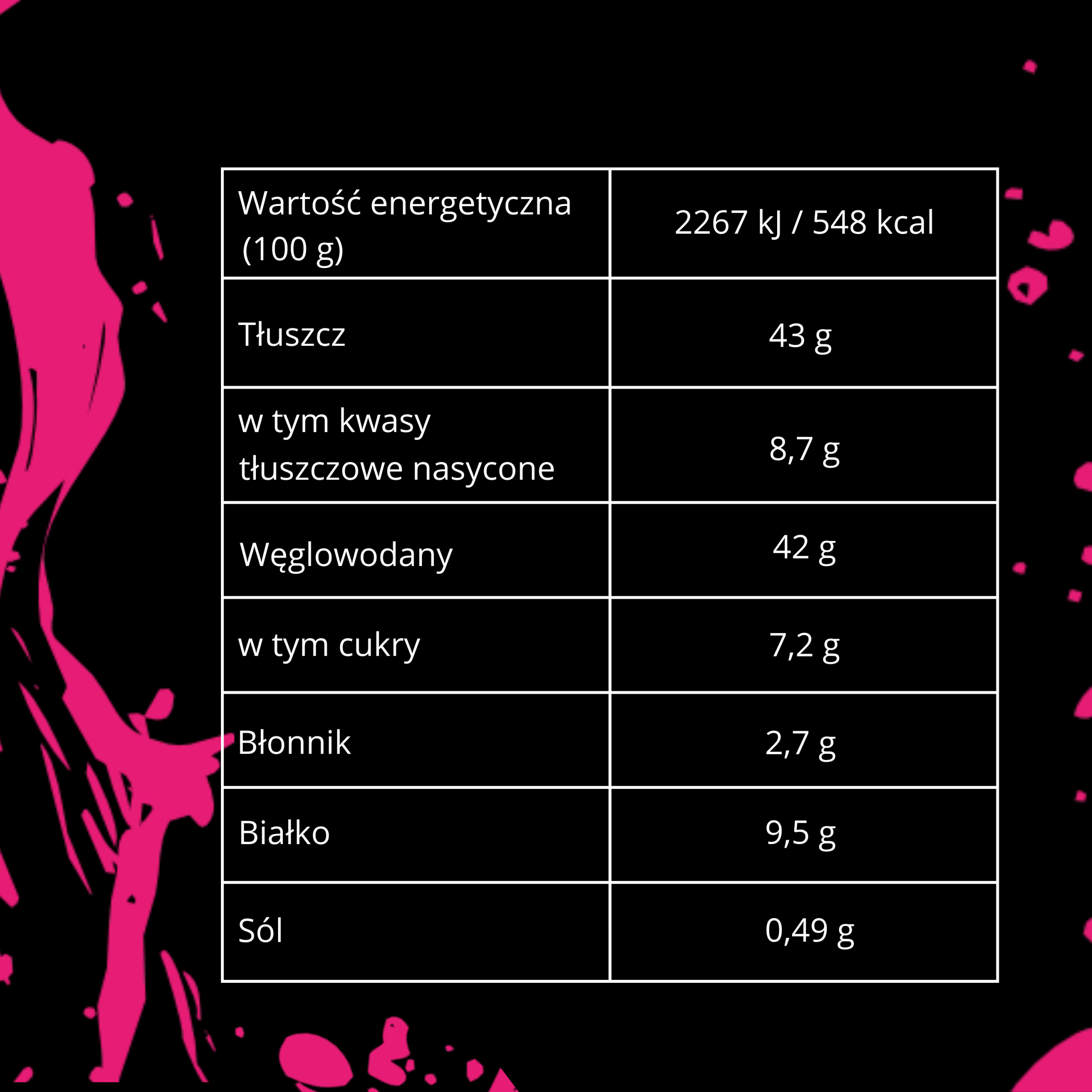 Wartość odżywcza produktu w 100g: 2267 kJ / 548 kcal, tłuszcz: 43 g, w tym kwasy tłuszczowe nasycone: 8,7 g, węglowodany: 42 g, w tym cukry: 7,2 g, białko: 9,5 g, błonnik: 2,7 g, sól: 0,42 g.