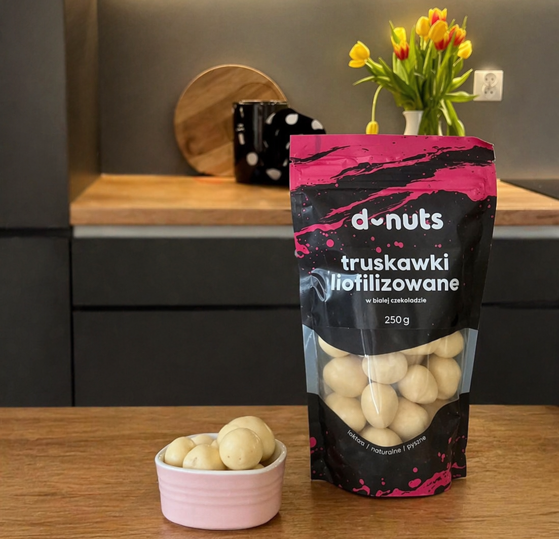 Poczuj połączenie soczystych, liofilizowanych truskawek pokrytych aksamitną białą czekoladą – idealną przekąskę na co dzień lub jako słodka chwila przyjemności pomiędzy posiłkami. Liofilizacja pozwala zachować intensywny aromat i smak owoców, a biała czekolada dodaje delikatnej, kremowej słodyczy. Gruba warstwa aksamitnej białej czekolady podkreśla bogactwo smaku truskawek, tworząc prawdziwą ucztę dla miłośników luksusowych słodkości.