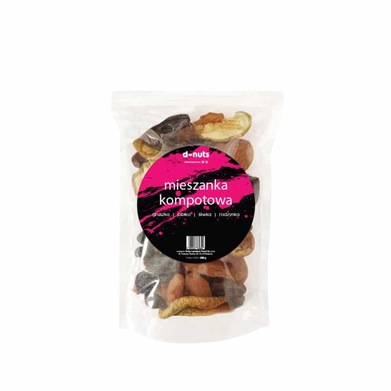 Skład: Gruszki suszone (30,5%), jabłka suszone (30,5%), śliwki suszone z pestką (30,5%), rodzynki (8,5%) (rodzynki, olej słonecznikowy, substancja konserwująca: dwutlenek siarki).